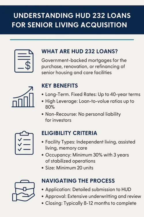 The HUD 232 loan is a mortgage insurance program administered by the Federal Housing Administration (FHA) specifically designed for senior care facilities. It provides long-term, fixed-rate financing for: